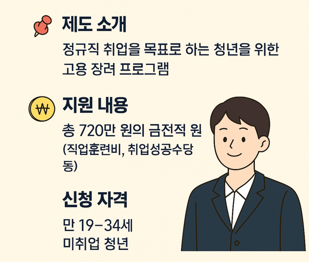 중소기업이 미취업 청년을 정규직으로 채용하고 일정 기간 고용을 유지하면, 정부가 해당 기업에 최대 1년간 총 720만 원을 지원해주는 제도예요.
