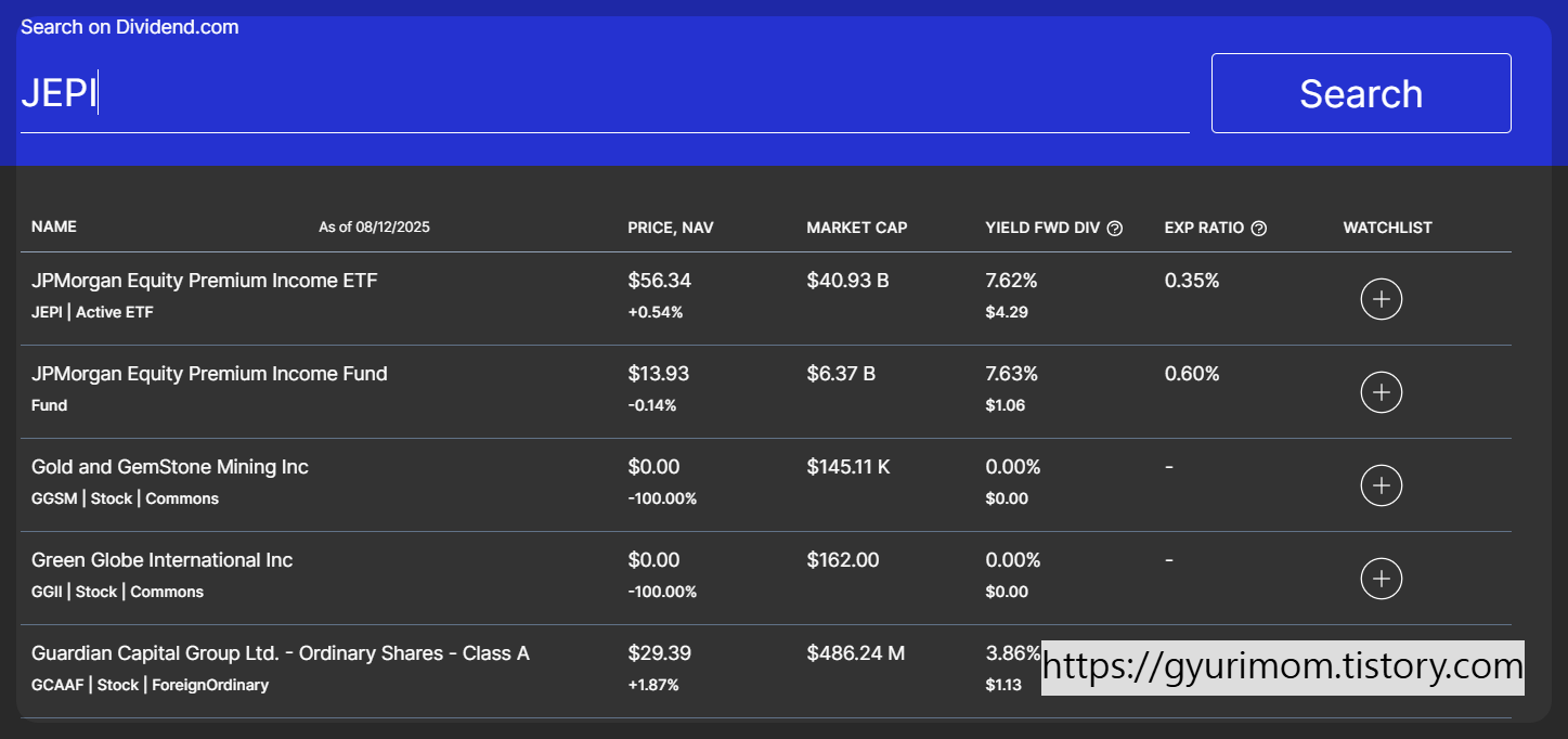 - 상단 검색창에 종목 티커(JNJ, O, JEPI 등) 입력