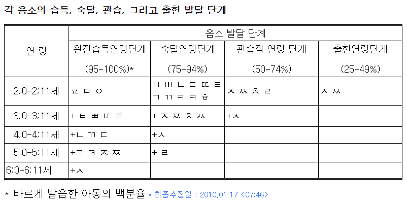 이런 건 보통 만 나이더라구요? 표에 따르면 'ㅅ'발음이 제일 나중에 완전 습득이 되고, 그 시기는 만6세 11월입니다.