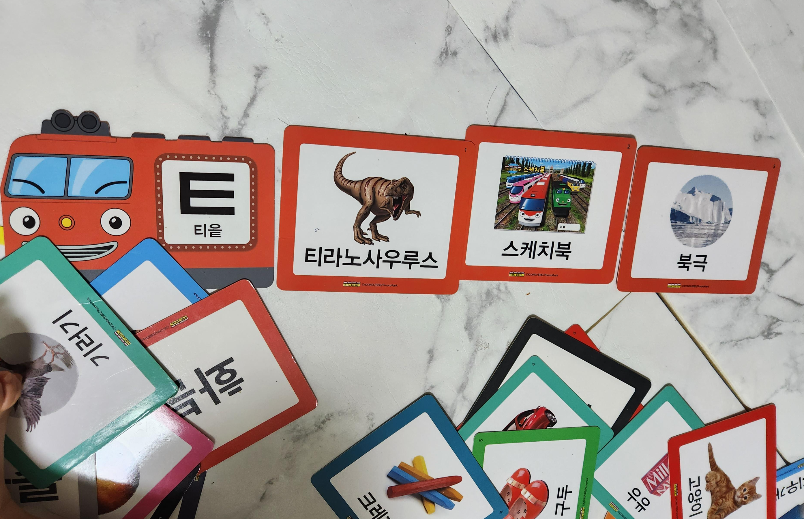 저희 집에 띠띠뽀 한글카드가 있는데, 위의 예시처럼 끝말잇기를 할 수 있어요. 이걸 해보려고 했는데 아직 저희 아이는 무리더라고요^^; 대신에 카드를 펼쳐놓고, "ㄱ이 들어간 걸 찾아보자!"로 가끔 놀이를 하고 있습니다.