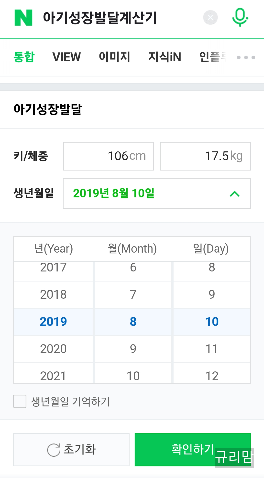 모바일 네이버 창에서 '아기성장발달계산기' 또는 '아기성장발달'로 검색하면
