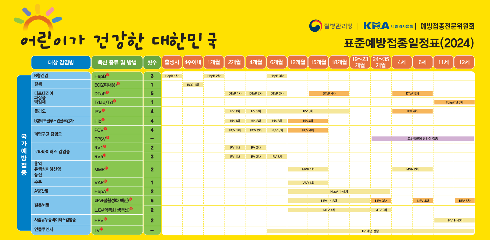 예방접종도우미 > 예방접종 정보 > 예방접종 알아보기 > 표준 예방접종 일정표 (kdca.go.kr)