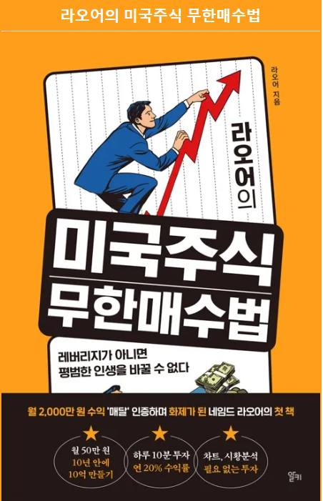 적은 투자로 비교적 큰 수익을 얻을 수 있는 게 뭐가 있을까 고민하다가, 우연히 본 라오어님의 무한매수법을 보고 아 이거다! 했지요. 표지에 보면, '레버리지가 아니면 평범한 인생을 바꿀 수 없다'라는 글이 나옵니다.