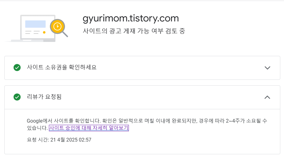 다시 사이트 승인 신청을 눌렀다 ㅠㅠㅠ
