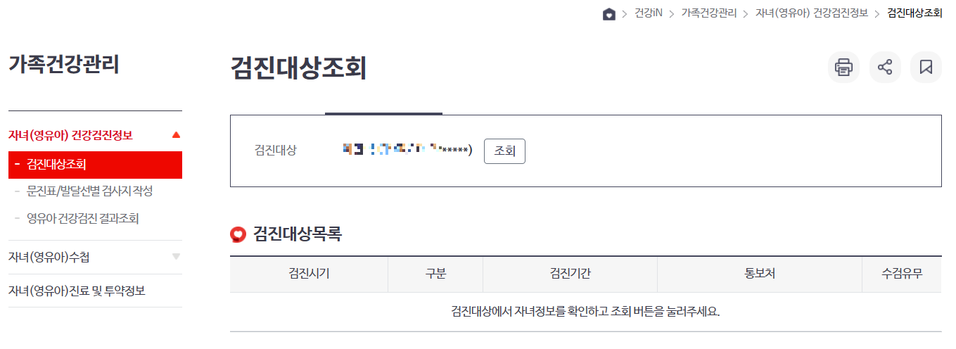 (모바일에서는 [건강iN] - [자녀(영유아)검진대상 조회]의 순으로 이동)