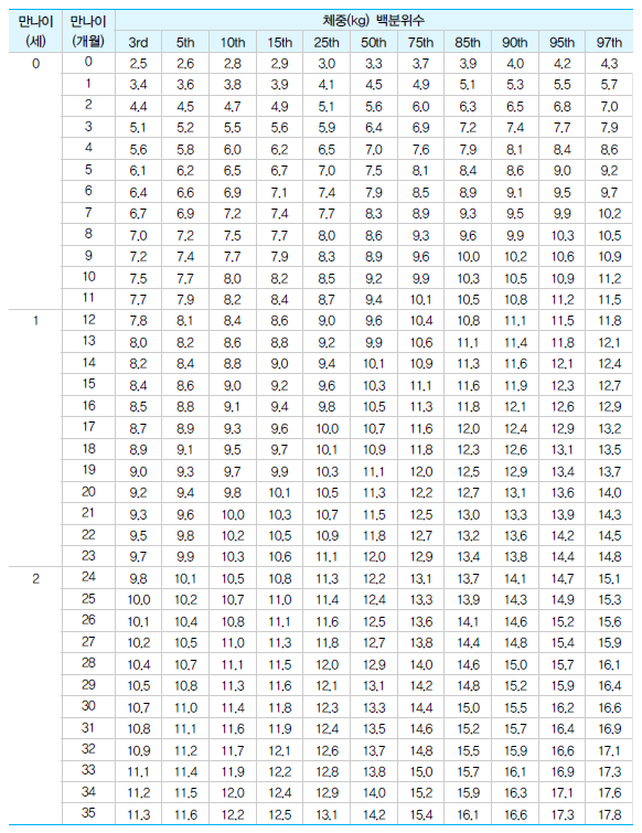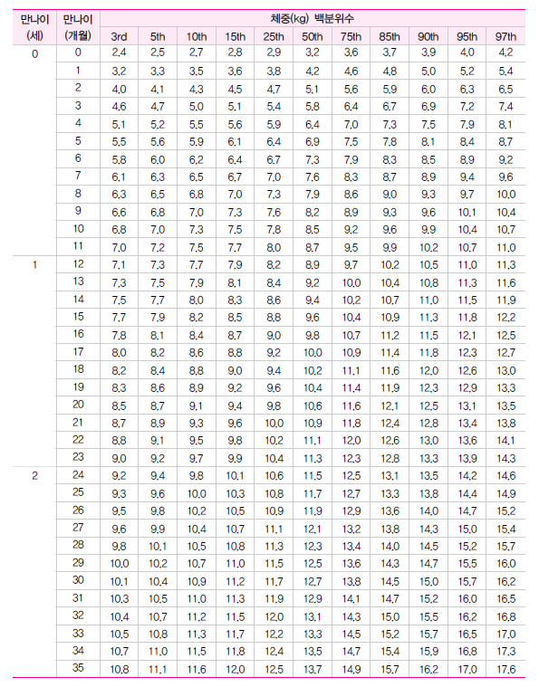 남아 0~35개월 체중 백분위수