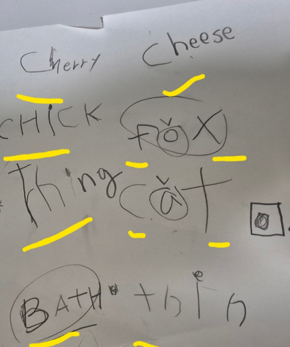 노란색 밑줄 그은 부분이 아들이 적은 스펠링. 빈칸을 두고 한글로 뜻을 말하거나 발음을 말해주면 우리가 스펠링을 맞췄다 ㅎㅎ